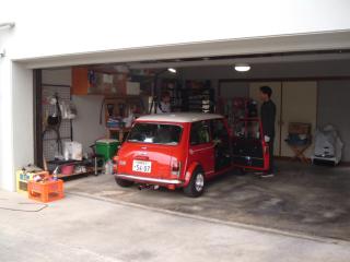 このレーシーな赤いミニが、今回のクランケ!モリコネMini−mori号です。クーパー98年型、オーバーフェンダー・10インチディスクブレーキローター換装・10インチタイヤ&ホイール仕様・etc のグッドスタイル! 更に詳しくは、今度制作予定のメンバー紹介でお伝えいたします。 それにしても、何度も言うようですが、いかがですか?このガレージ。男なら憧れますよね〜! |