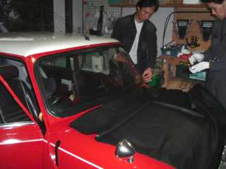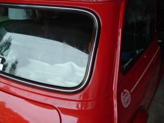 自分が到着した時には、もう既に作業は始まっていました。まずは、古くなって真っ黒に変色したリアーのウェザーストリップ・モールの交換です。なぜかこのモールは、経年変化で黒く変色してしまい、ミニがとても古ぼけて見えてしまいます。防水とガラスを抑えるためには無くてはならない重要なもので、もう少し良いものを付けて欲しいと切望しても、もうミニは製造していないんですよね〜! 写真では、すでに交換が終了していてミニが新たしく生まれ変わっています。交換には、専用工具が必要で、その行程と工具を写真で紹介できなかったのは、とても残念!また次の機会には、忘れずに撮影して紹介したいと思います。 |