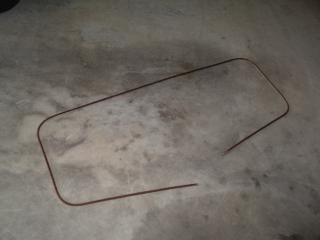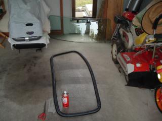 これが、取り外したフロント側のウェザーストリップです。きれいにフロントガラスの形になっていますが、実は新品の形はただの楕円形で、こんなきれいな長方形にはなってないんですよ〜、知ってました?(写真が無いのが残念!) 1台目のとき、初めて見るこの楕円形のストリップにはとても戸惑って、取付けにも相当苦労したようです。 そして今回の2台目からは、その教訓が活かされるという訳ですね〜! |