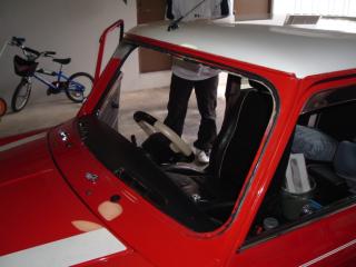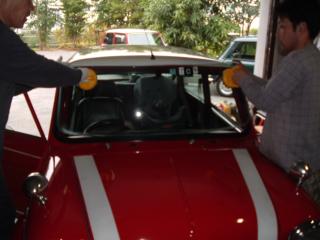 ミニのフロントガラス(ウィンドシールド)です。 何だかとても小さく見えますね〜!少しブルーがかっていて、これがUVカットと云うんでしょうか? 余談ですが、シールド上面に張られた白黒のステッカーは、アメリカ軍基地への通行認識票で、そう、Mini−mori号は、ベースの中を行き来することが出来るんです。 |