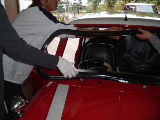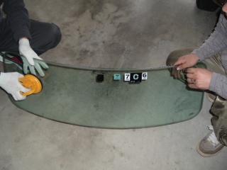 さて、楕円形のストリップを新しいウィンドシールドにガムテープで固定しておきました。こう見えても、これが4人掛かりで押さえつけながらの大変な作業で、少しでも形が馴染むのではないかと安易な期待を寄せての作業でした。後にこのストリップの周囲に紐を巻きつけるように掛けるのですが、固定したテープがポロポロ外れて、結局この作業は元の木阿弥!無駄な努力に終りました。 |