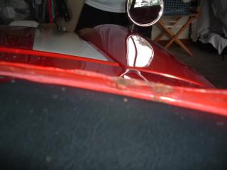 やはり、ストリップ取付け部分の淵にサビが発生していますね〜!ほって置くと大変なことになるところでした。まずは、サビを取り除いてサビチェンジャーを塗りこみ、取り付け枠の淵全体を防錆塗料で念入りに処理をしておきます。 |