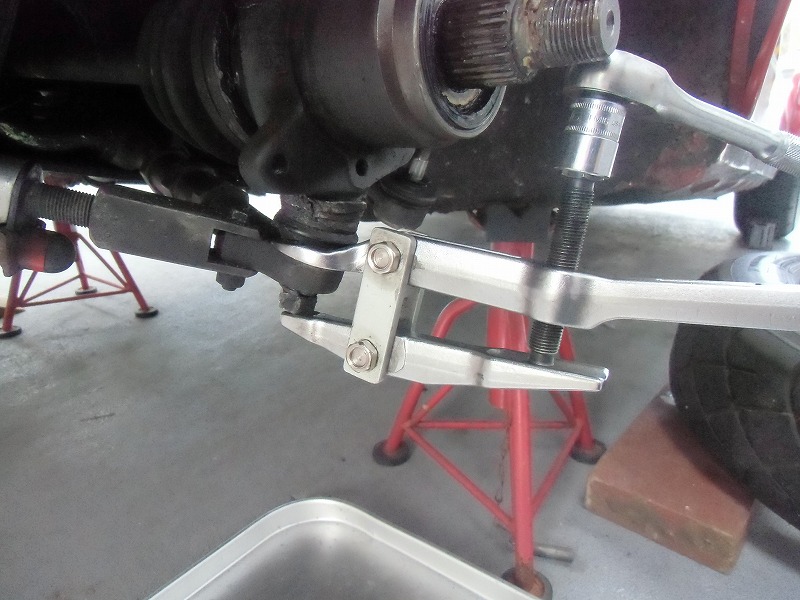 続いて・・専用プーラーを使用してアッパー/ロアアームからポールジョイントとタイロットエンドを抜く・・毎回この作業で割れる様な物凄い音が嫌ですね(笑)・・・・