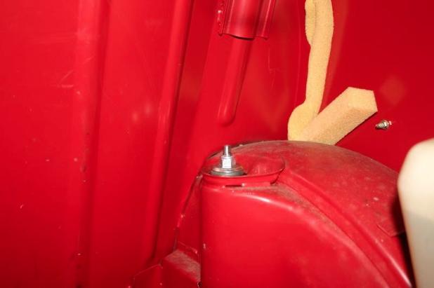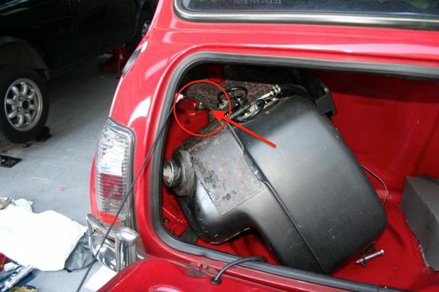 ガソリンタンクの取外しは、タンクを固定してある帯状のベルト金具の下側に付いている